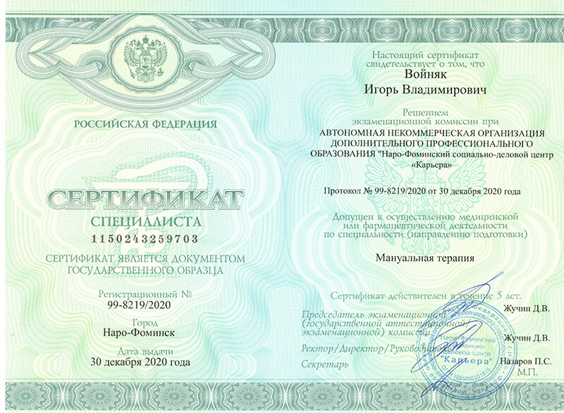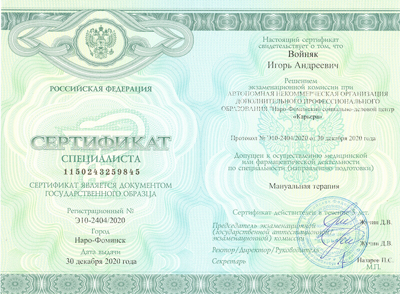 Для записи на консультацию невролога Войняк Игорь Андреевича, вы можете воспользоваться нашим сайтом или написать в Telegram, WhatsApp по телефону +7 904 402 7402 (администратор), +7 993 324 9492 (врач). Администратор поможет вам выбрать удобное время для консультации и и соберёт предварительную информацию о состоянии вашего здоровья.